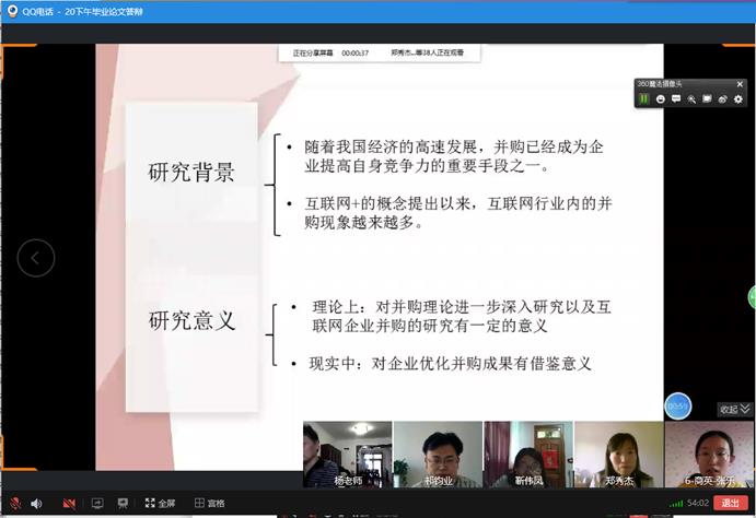 在答辩过程中,线上答辩严格遵循线下答辩的严质量高标准。首先,答辩组组长介绍答辩老师,宣读答辩流程,点名确定答辩学生到场,强调答辩纪律。随后,答辩学生汇报论文研究框架、研究内容、研究方法、研究结论、创新点和不足之处等。评委在听取学生陈述后,依次就论文选题、结构、内容和论文的规范性等方面提问和提出修改意见。本组学生全部答辩完成后,答辩组老师进行答辩评议并通告学生答辩结果。