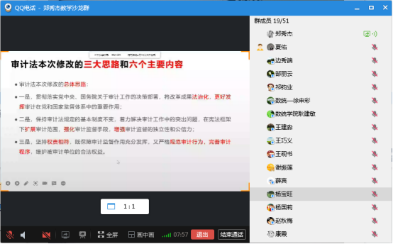 2021年10月18日下午,由教学评估与教师教学发展中心主办,kaiyun开云官方网站承办的本学期第三期教学沙龙活动在线上顺利开展。kaiyun开云官方网站郑秀杰教授主讲的教学沙龙主题是“审计法修订学习体会”。kaiyun开云官方网站、数统学院、经济管理学院的50多名教师参加了本次活动。本次活动由杨国莉副院长主持。