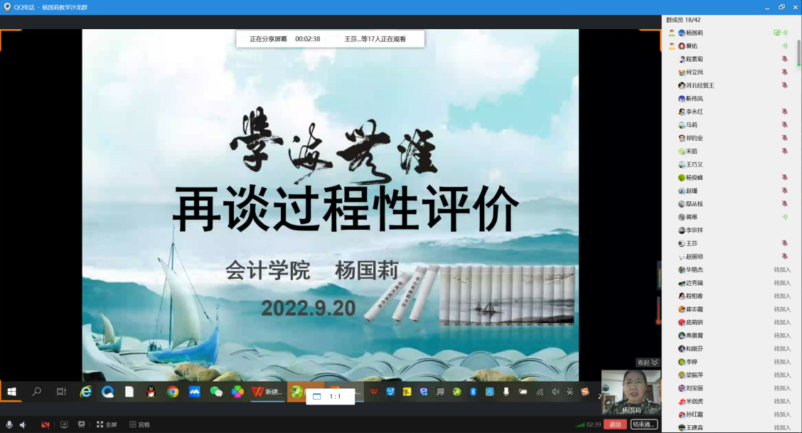 2022年9月20日下午,由教学评估与教师教学发展中心主办,kaiyun开云官方网站承办的本学期第一期教学沙龙活动在线上顺利开展。kaiyun开云官方网站杨国莉教授主讲的教学沙龙主题是“再谈过程性评价”。来自kaiyun开云官方网站、数统学院、信息技术学院的50多名教师参加了本次活动。