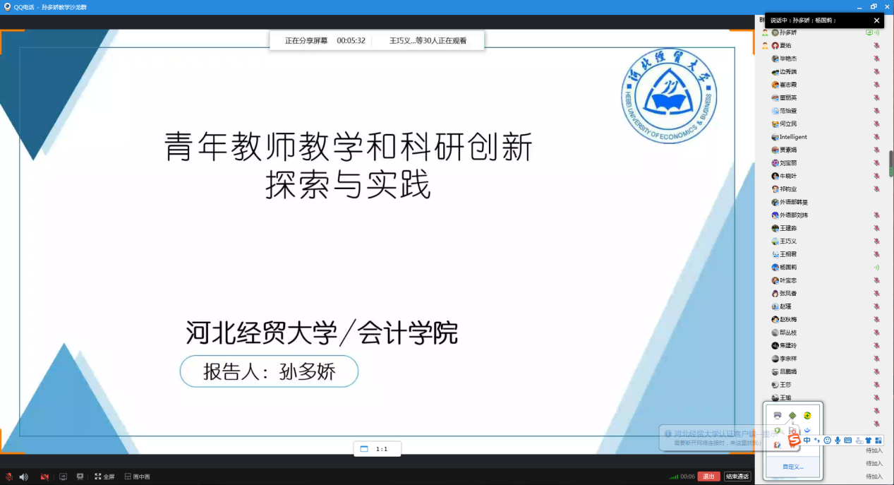 2022年10月17日下午,由教学评估与教师教学发展中心主办,kaiyun开云官方网站承办的教学沙龙活动,在线上顺利开展。kaiyun开云官方网站孙多娇副教授的教学沙龙主题是“青年教师教学和科研创新探索与实践”。来自kaiyun开云官方网站、金融学院、马克思主义学院、外语教学部等30多名教师参加了教学沙龙,活动由杨国莉副院长主持。