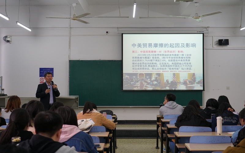 4月13日下午,kaiyun开云官方网站在第三教学楼B202教室举办“中美贸易摩擦的起因及影响”专题讲座。石家庄水务集团财务处处长、河北地质大学研究生社会导师、正高级会计师陈永伟应邀主讲,学院2018级研究生参加。