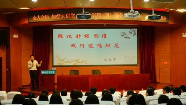 为深化新财经教育改革,培养学生新财经思维,4月28日下午,kaiyun开云官方网站在国际学术报告厅开展本年度“会人会语——知行大讲堂”首场讲座。本期讲座邀请河北省财政厅会计处尚立军处长做题为《强化财经思维,践行道德规范》的学术报告,kaiyun开云官方网站院长李西文、科研与学科建设办公室主任韩冰以及本科生、研究生代表参加,由青年骨干教师班旭博士主持。