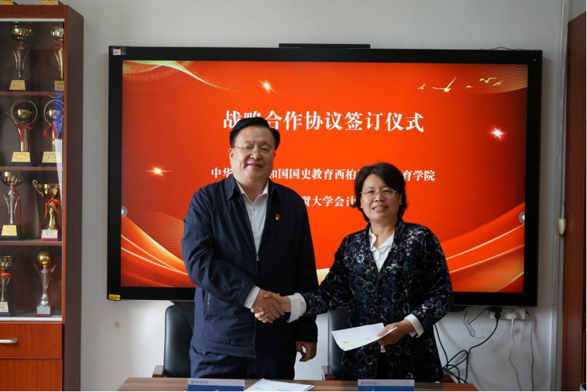 李西文与田爱民代表双方签署了战略合作协议。根据合作协议框架,双方将稳步推进各项合作项目的落地实施,充分发挥各自在教育资源和红色文化传承方面的优势,积极推动高等教育与红色文化教育的融合创新,致力于培养一批兼具红色基因和专业素养的新财经人才,为社会发展输送高质量人才资源。