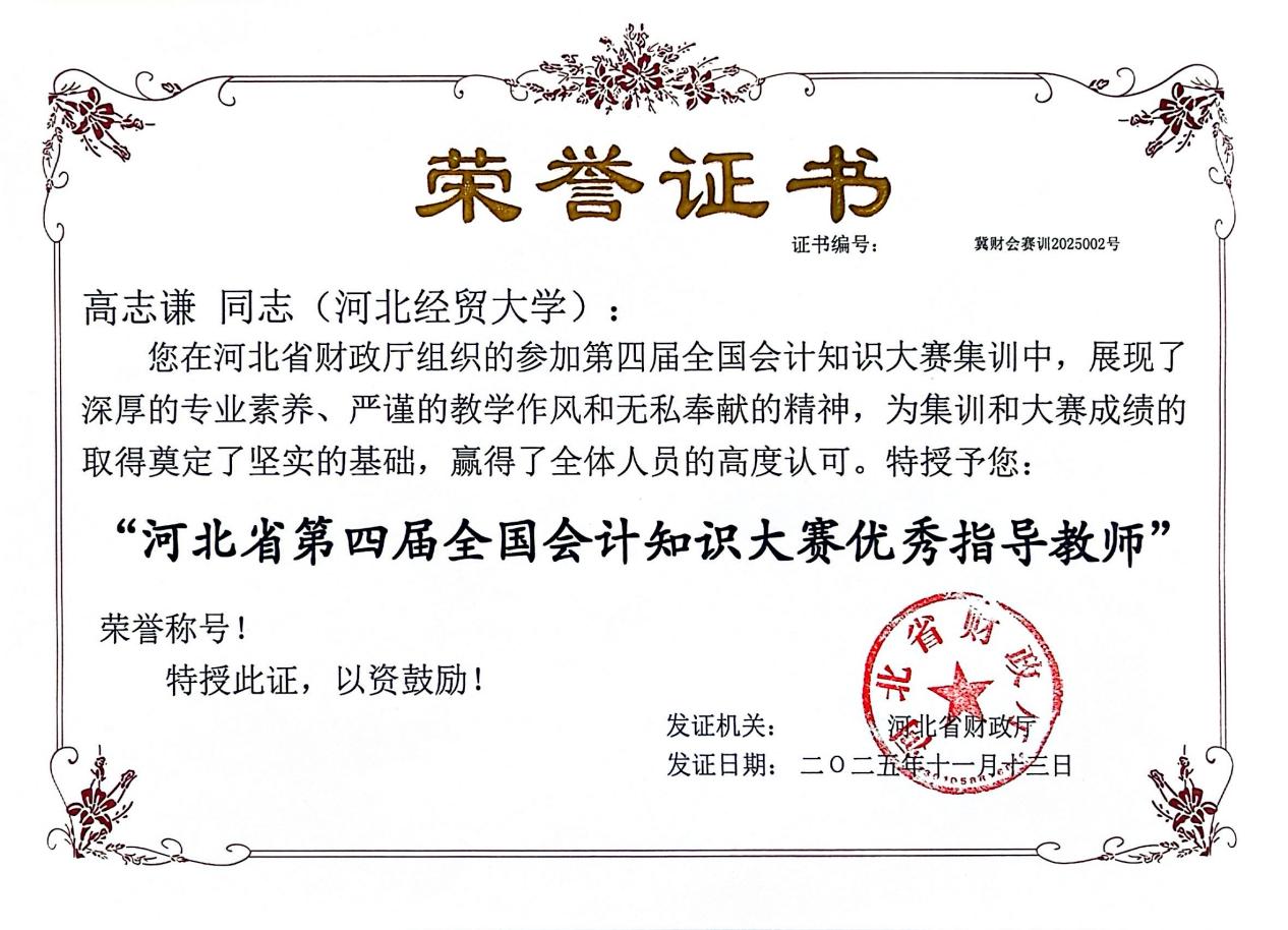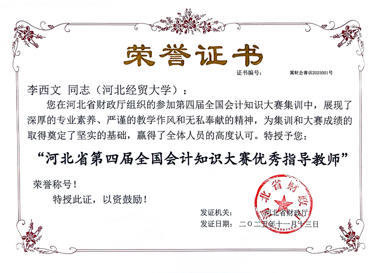 在全国总决赛备战阶段,kaiyun开云官方网站李西文、高志谦两位教师受邀参加河北省队队员选拔和培训全过程。面对集训时间紧、任务重的挑战,两位教师充分发挥专业优势,系统制定详细集训方案,全面梳理会计专业知识体系的重点与难点,结合赛事特点精心编撰多套测试题卷与练习题库,毫无保留地分享实用答题技巧与备考方法,有效提升了我省参赛选手的知识储备与竞技能力,为河北省代表队在全国总决赛中斩获优胜奖筑牢坚实基础。其严谨细致的教学作风与无私奉献的精神,赢得了省财政厅主管领导的高度认可和一致好评。因突出贡献,李西文、高志谦被河北省财政厅授予“河北省第四届全国会计知识大赛优秀指导教师”荣誉称号。