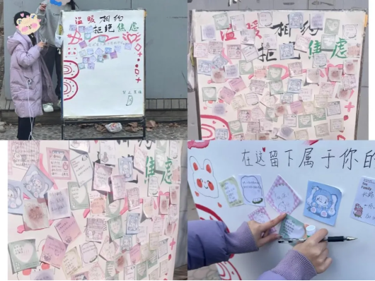同学们在便利贴上书写愿望或苦恼,粘贴到绘制的展板上,其他同学可以选择便利贴,尽自己所能来帮助他人排忧解难或实现愿望。此项活动鼓励同学们拥抱温暖,拒绝焦虑,传递正能量。
