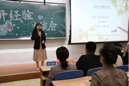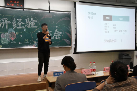 王煜学长有的放矢地对会计专硕和审计专硕的侧重点作出分析,向大家介绍如何在二者之间进行选择,并强调了数学的重要性。他以考研时间为轴,向同学们推荐了不同阶段有效的学习方法和视频学习资料。学长的发言条理清晰,风趣幽默,同学们认真倾听,有所收获。