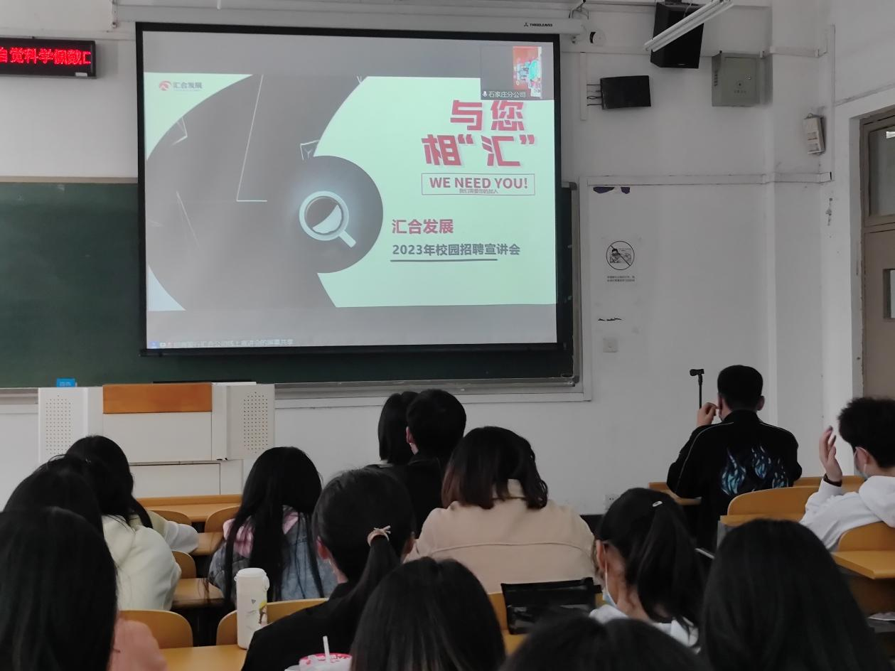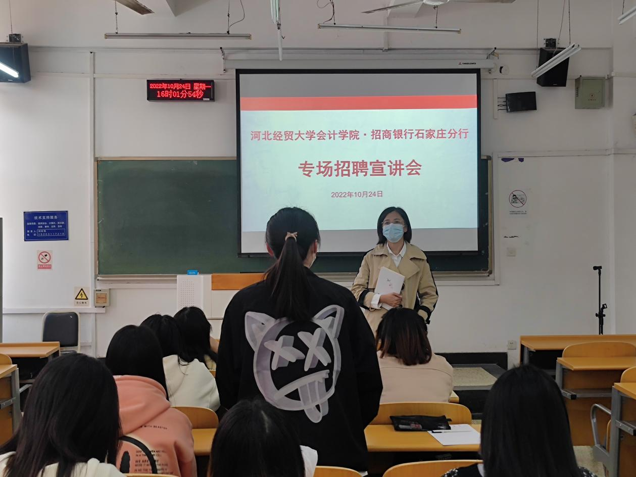 10月24日下午3点,kaiyun开云官方网站在北三教B110举办招商银行石家庄分行专场招聘宣讲会,宣讲会线上线下同时进行,学院党委副书记程丽梅、就业联络员付磊和近百名同学参加了此次招聘会。