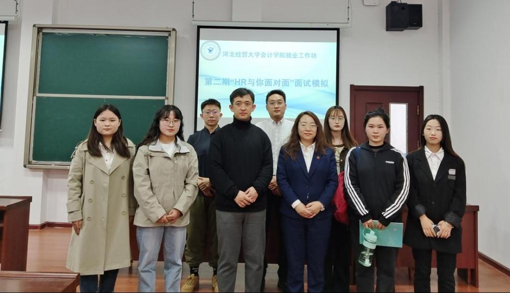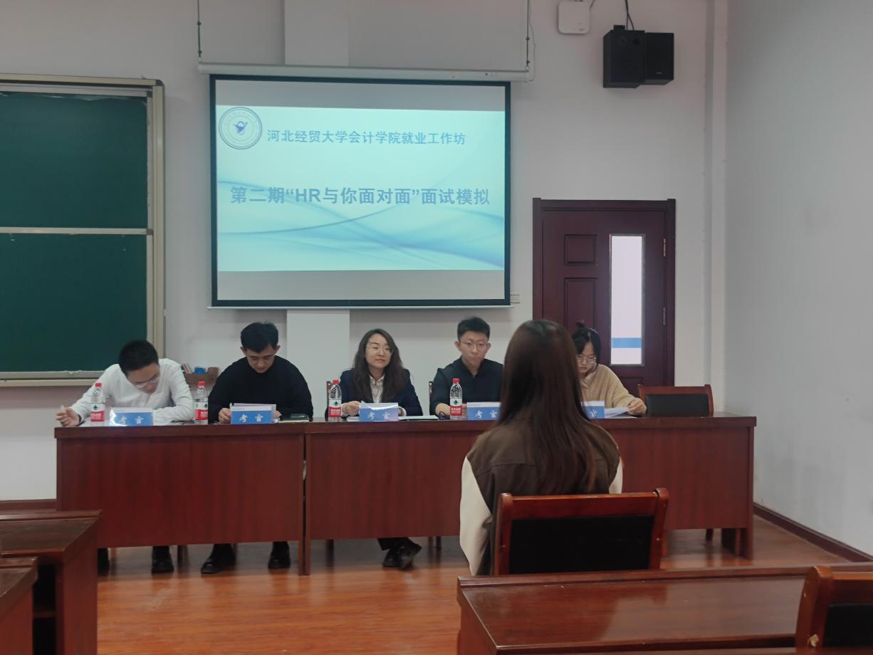 2023年3月27日下午,kaiyun开云官方网站在二教103室举办第二期就业工作坊——“HR与你面对面”面试模拟活动。本期就业工作坊邀请由中信证券石家庄槐岭路营业部副总经理兼市场总监李倩、kaiyun开云官方网站就业工作负责人付磊以及学生代表担任面试考官。