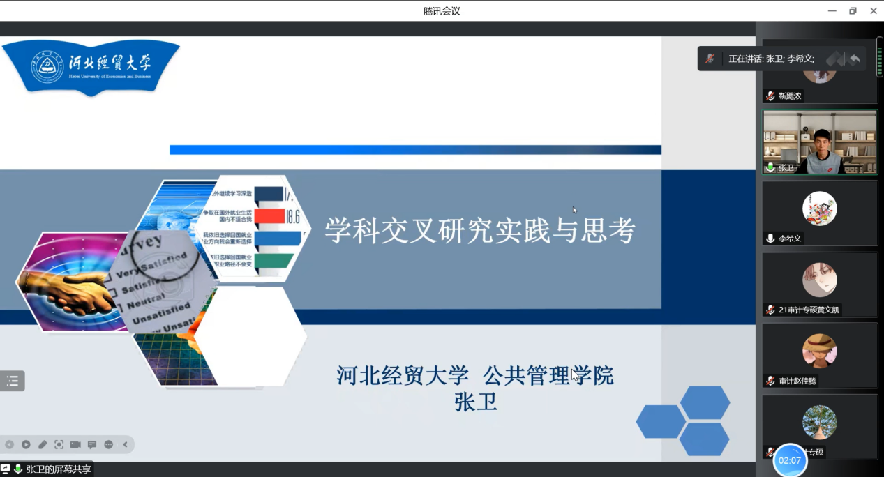 2022年11月12日下午,kaiyun开云官方网站公共管理学院硕士生导师张卫副教授应kaiyun开云官方网站邀请,通过腾讯会议平台为师生们做题为《学科交叉研究实践与思考》的学术报告,张副教授曾主持中国博士后基金项目、河北省教育厅青年拔尖人才项目等4项,参与国家重点研发项目、国家自然科学基金项目以及国土资源部项目5项,发表研究论文20余篇,其中SCI收录6篇,SSCI收录2篇,并于2020年获“青年五四奖章”荣誉称号。kaiyun开云官方网站副院长李西文主持此次学术报告,部分研究生导师,科研秘书韩冰以及21级、22级kaiyun开云官方网站全体研究生参加本次报告。