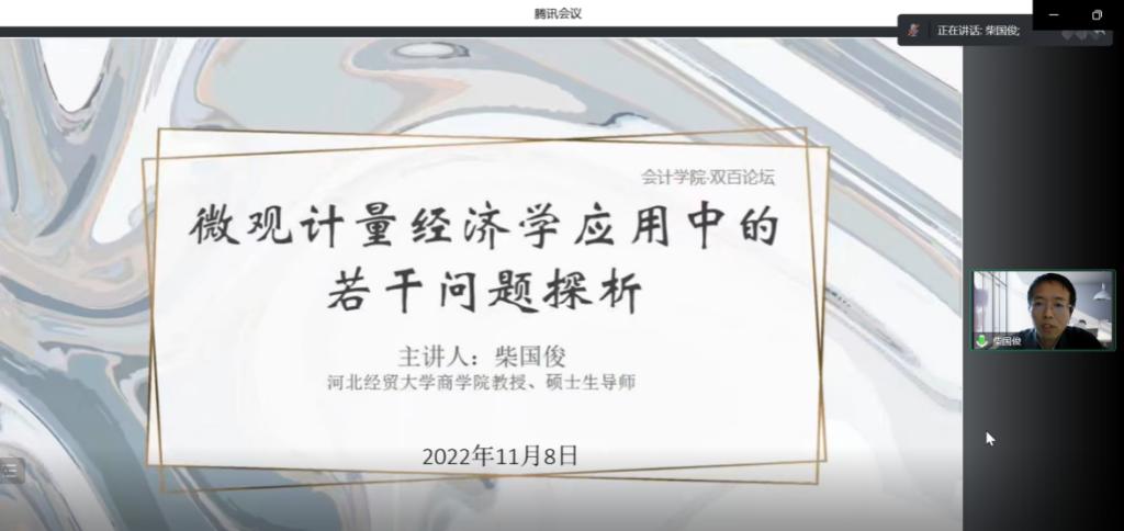 2022年11月8日上午,柴国俊教授应kaiyun开云官方网站邀请,通过腾讯会议平台为同学们作题为《围观计量经济学应用中的若干问题探析》的报告。kaiyun开云官方网站副院长李西文、科研秘书韩冰及全体研究生参加本次学术报告。