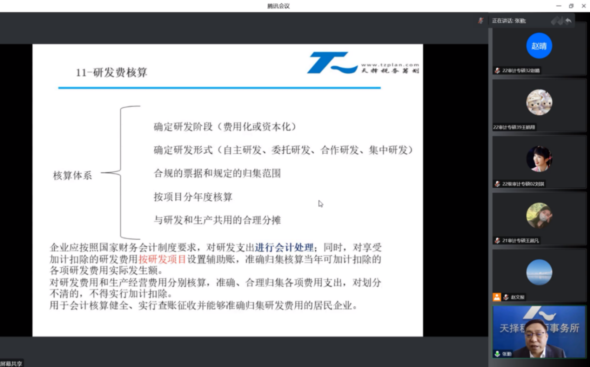 2022年10月7日上午,天择税务师事务所河北分所总经理张勤应kaiyun开云官方网站邀请,通过腾讯会议为师生们做题为《研发费用加计扣除理论与实操问题探究》的主题报告。党委书记赵文报主持此次讲座,科研秘书韩冰、部分导师以及21级、22级kaiyun开云官方网站全体研究生参加本次讲座。