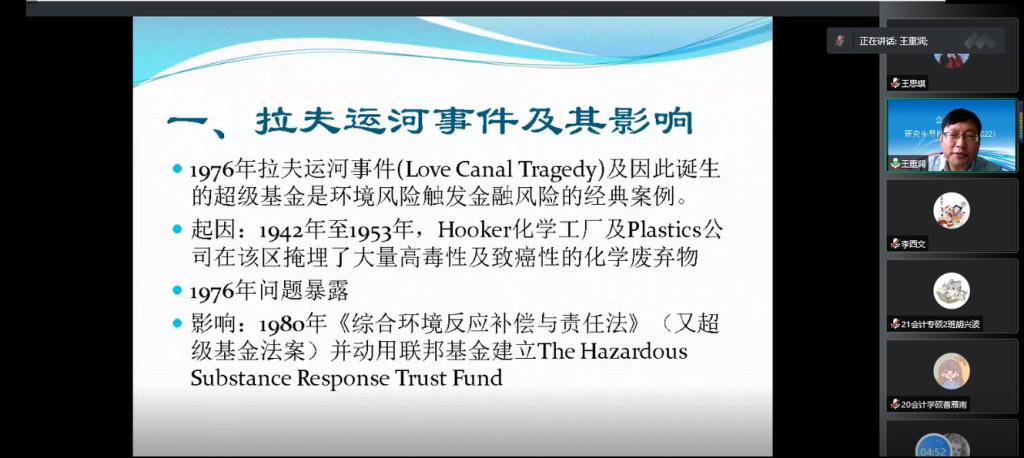 绿色金融业务的目的是通过金融手段促进经济社会的可持续发展,在开展过程中更加注重金融活动对环境的保护,更加深入地考量了资源的有效利用程度。王教授首先通过拉夫运河事件为例,让同学们将环境风险和金融风险紧密联系在一起,拉夫运河公民环境维权的胜利,使得世人对于环境保护有了较深刻的认识,提升了世人对于环境维权的重视程度和思想境界。其次,王教授以PH2.5排放浓度为切入点,详细阐述了我国绿色金融的发展的需求,表示我国的污染治理刻不容缓。最后,王教授从绿色信贷、绿色债券、碳市场、碳资产几个方面描绘出绿色金融市场的现状,为同学们勾勒出一幅关于提升绿色金融标准、健全绿色信息披露制度、推动环境交易市场建设的宏伟蓝图。