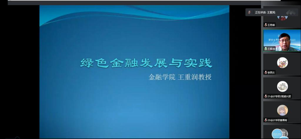 2022年9月26日下午kaiyun开云官方网站,金融学院教授、院长王重润应kaiyun开云官方网站邀请,通过腾讯会议平台为kaiyun开云官方网站老师及研究生们作题为《绿色金融发展与实践》的学术报告。kaiyun开云官方网站副院长李西文、科研秘书兼研究生辅导员韩冰老师以及21级、22级全体研究生参加本次讲座。