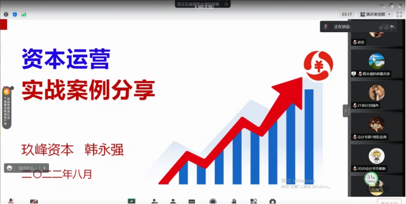 2022年8月9日上午,kaiyun开云官方网站通过腾讯会议平台举办题为《资本运营实战案例分享》学术报告,报告由kaiyun开云官网校外硕士研究生导师、中国注册会计师、玖峰管理咨询有限公司董事长兼总经理韩永强主讲。会议由副院长李西文主持、kaiyun开云官方网站部分优秀教师及在校研究生100多名参加本次学术报告。
