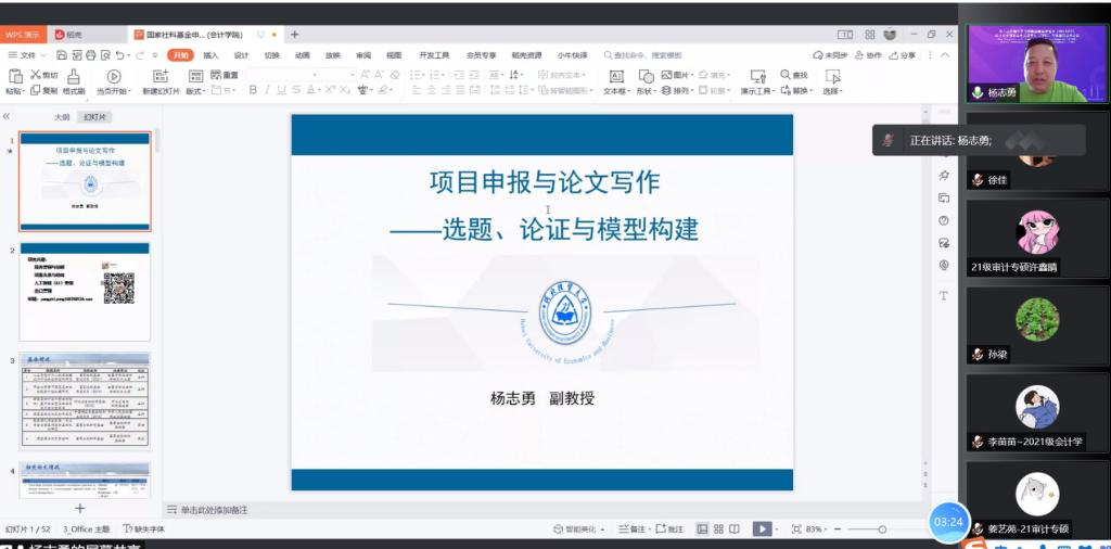 2022年5月31日上午,kaiyun开云官方网站杨志勇副教授应kaiyun开云官方网站邀请,通过腾讯会议平台为kaiyun开云官方网站老师及研究生们作题为《项目申报与论文写作——选题、论证与模型构建》的学术报告。副院长李西文、kaiyun开云官方网站部分教师以及20级、21级全体研究生参加本次讲座。