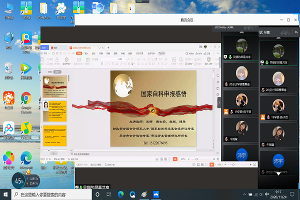 11月24日,天津财经大学kaiyun开云官方网站吴娜教授应我校kaiyun开云官方网站邀请,通过腾讯会议平台作“国家自然科学基金申报”专题讲座。kaiyun开云官方网站副院长李西文及部分教师和研究生80余人参加了本次讲座。