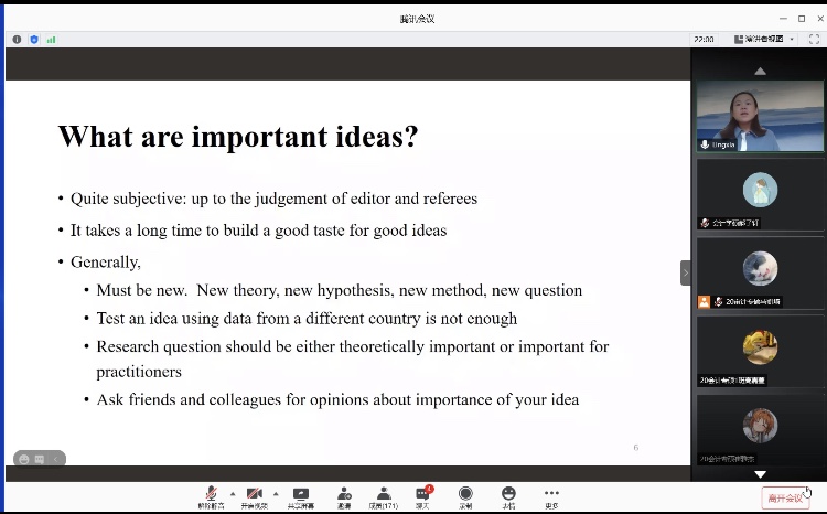 2020年10月13日上午,中山大学国际金融学院孙凌霞博士应kaiyun开云官方网站邀请,通过腾讯会议平台为同学们作题为《如何撰写和发表高水平论文》的报告。kaiyun开云官方网站副院长李西文、学院部分教师及2019级、2020级全体研究生参加了本次讲座。